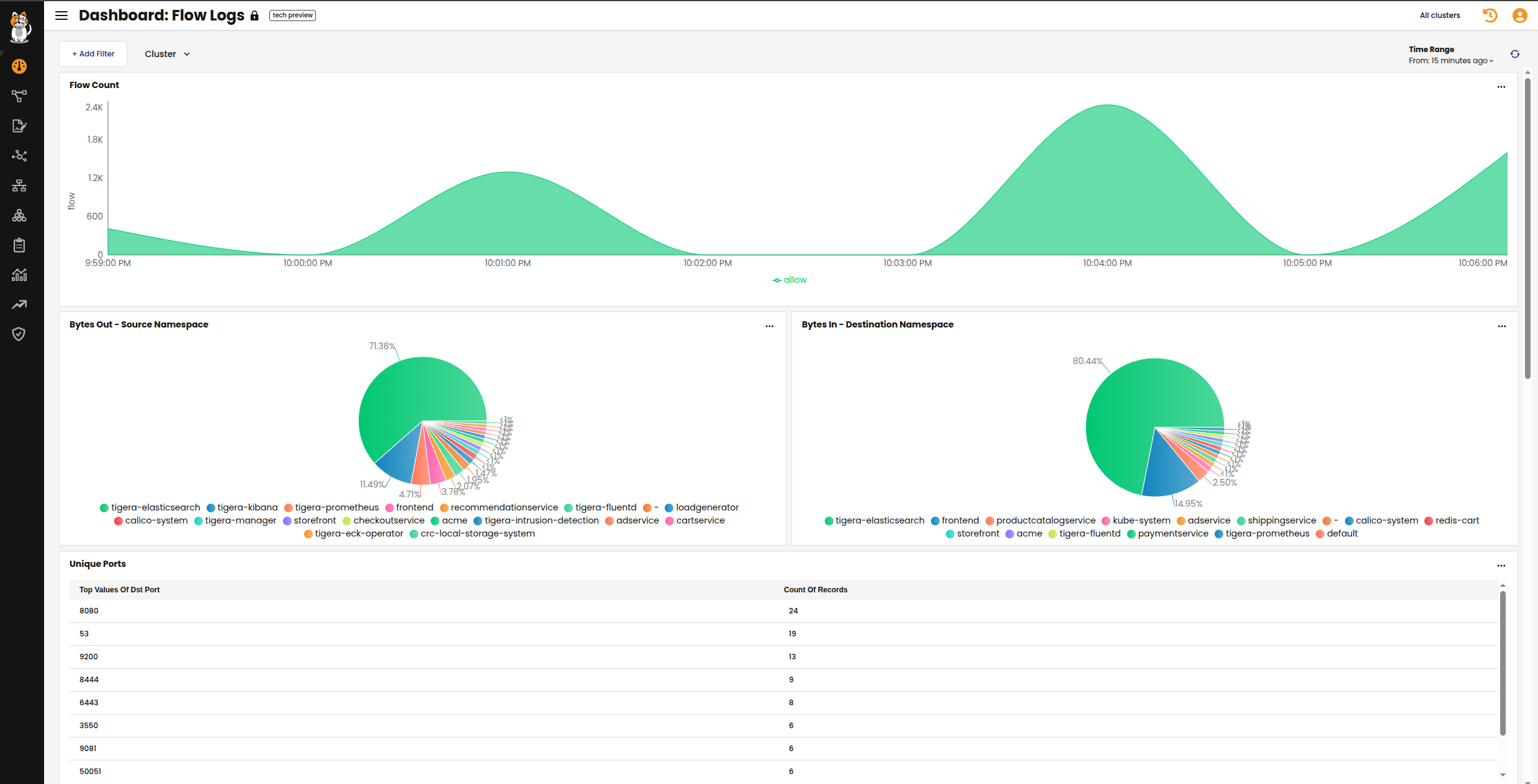 The Flow Logs dashboard gives you an overview of how packets are being sent and received by all the pods in your cluster. Seeing this data helps you spot unusual flow activity, which may indicate a compromise.